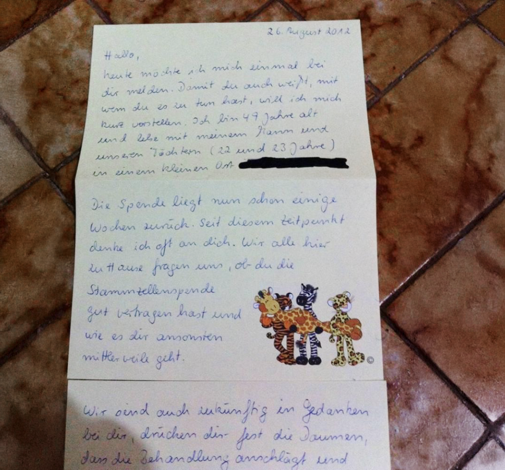 Murilo surpreendeu sua doadora alemã com um e-mail e a foto da sua tatuagem. À DW, ele conta que sente uma ligação com a doadora e por isso quis eternizar na pele suas palavras na caligrafia da carta: