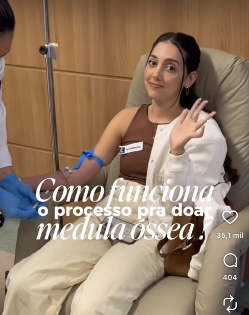 Intitulados de “Diário de Doação de Medula Óssea”, os posts juntos já ultrapassam 1,6 milhão de visualizações apenas no Instagram. Em um vídeo extra de esclarecimentos, Sarah explica como funciona o processo de cadastro, detalha cada etapa da doação e reforça que todas as etapas são gratuitas para pacientes e doadores (tudo custeado pelo SUS).